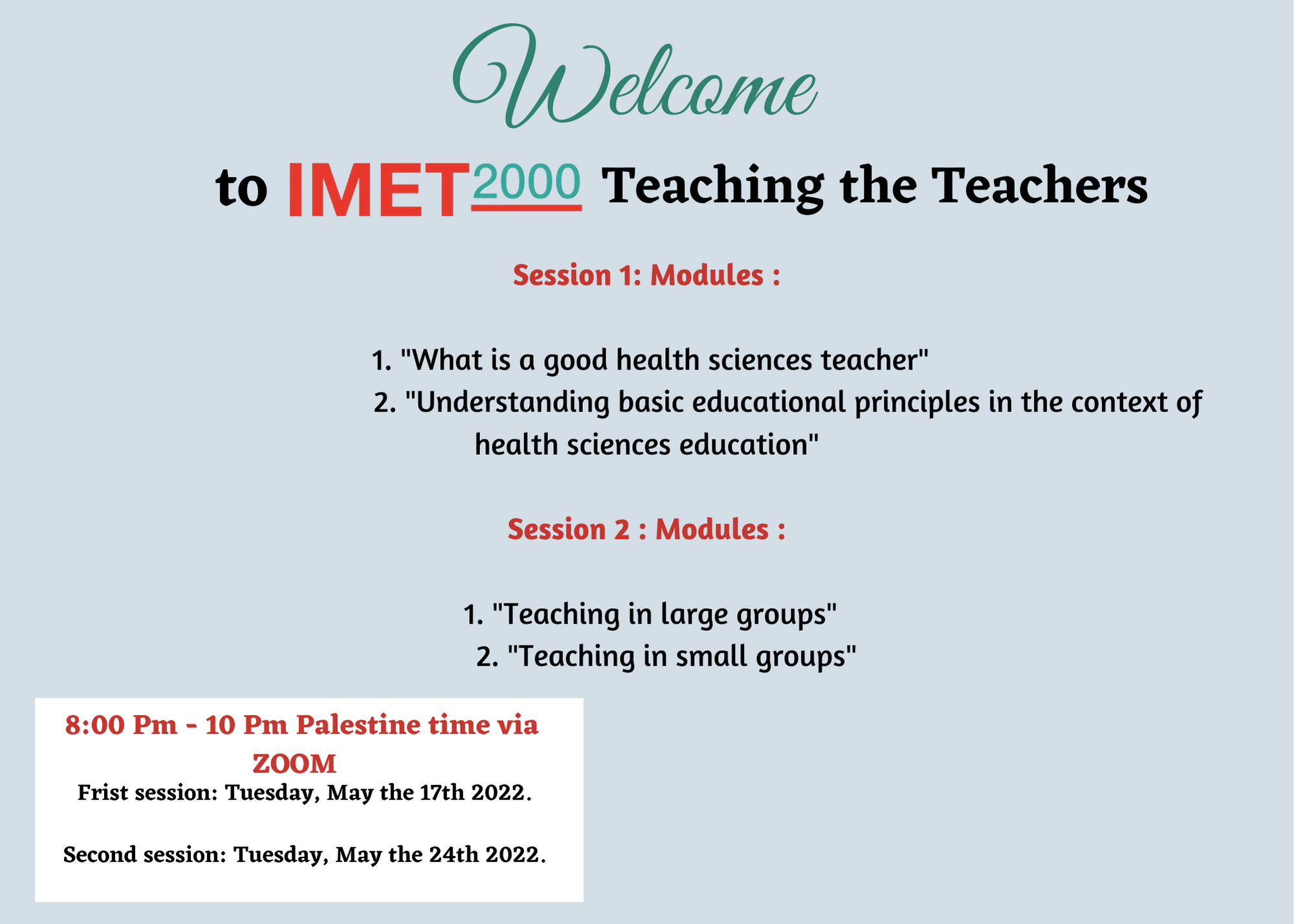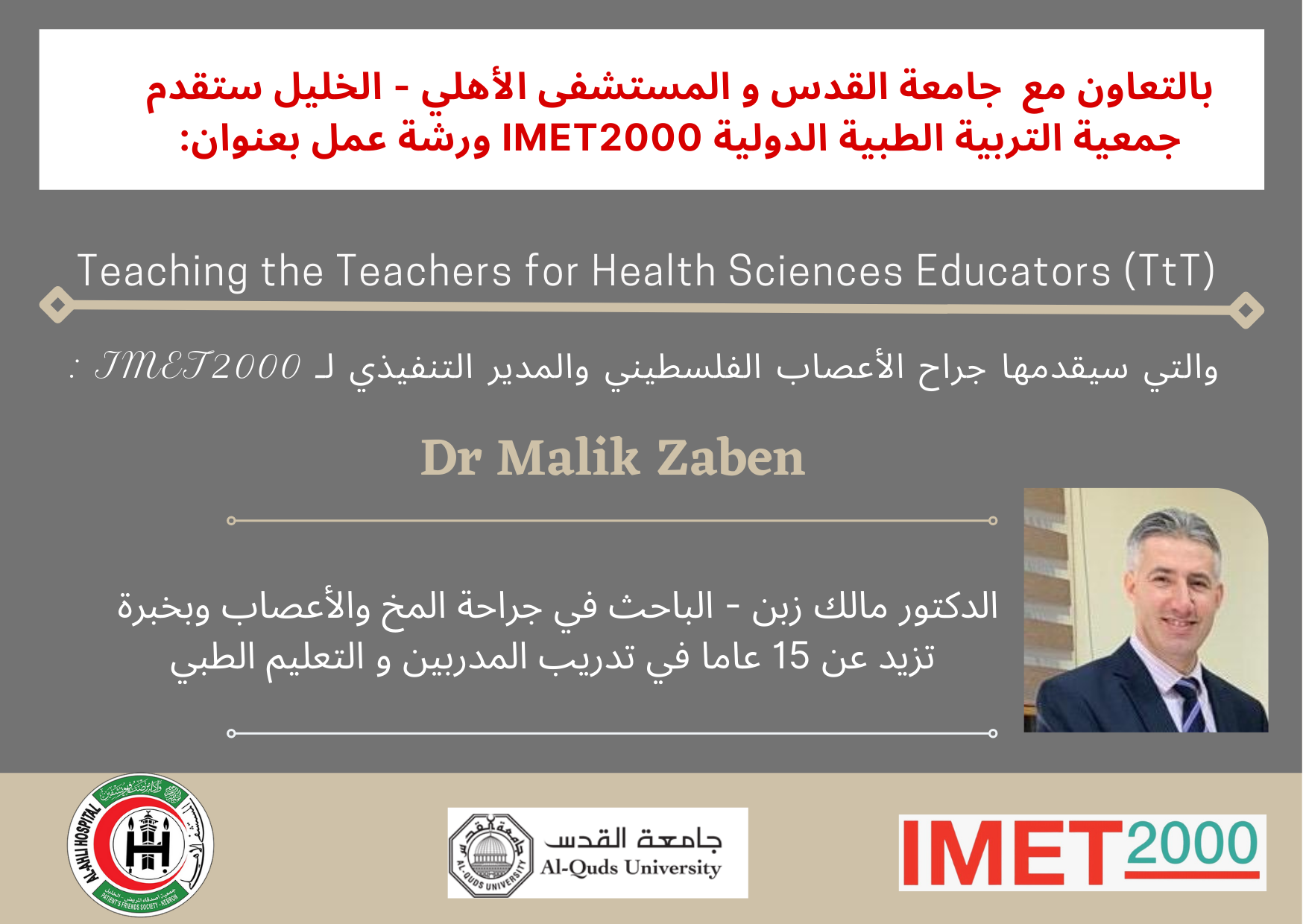 So, it's our utmost pleasure to announce the kick-off of "Teaching the Teachers for health care educators" joint training program between IMET2000-Palestine, Al Quds University and Al Ahli Hospital, which aims to meet the need, train, and provide medical educators with a greater understanding of the advanced principles of learning and teaching.