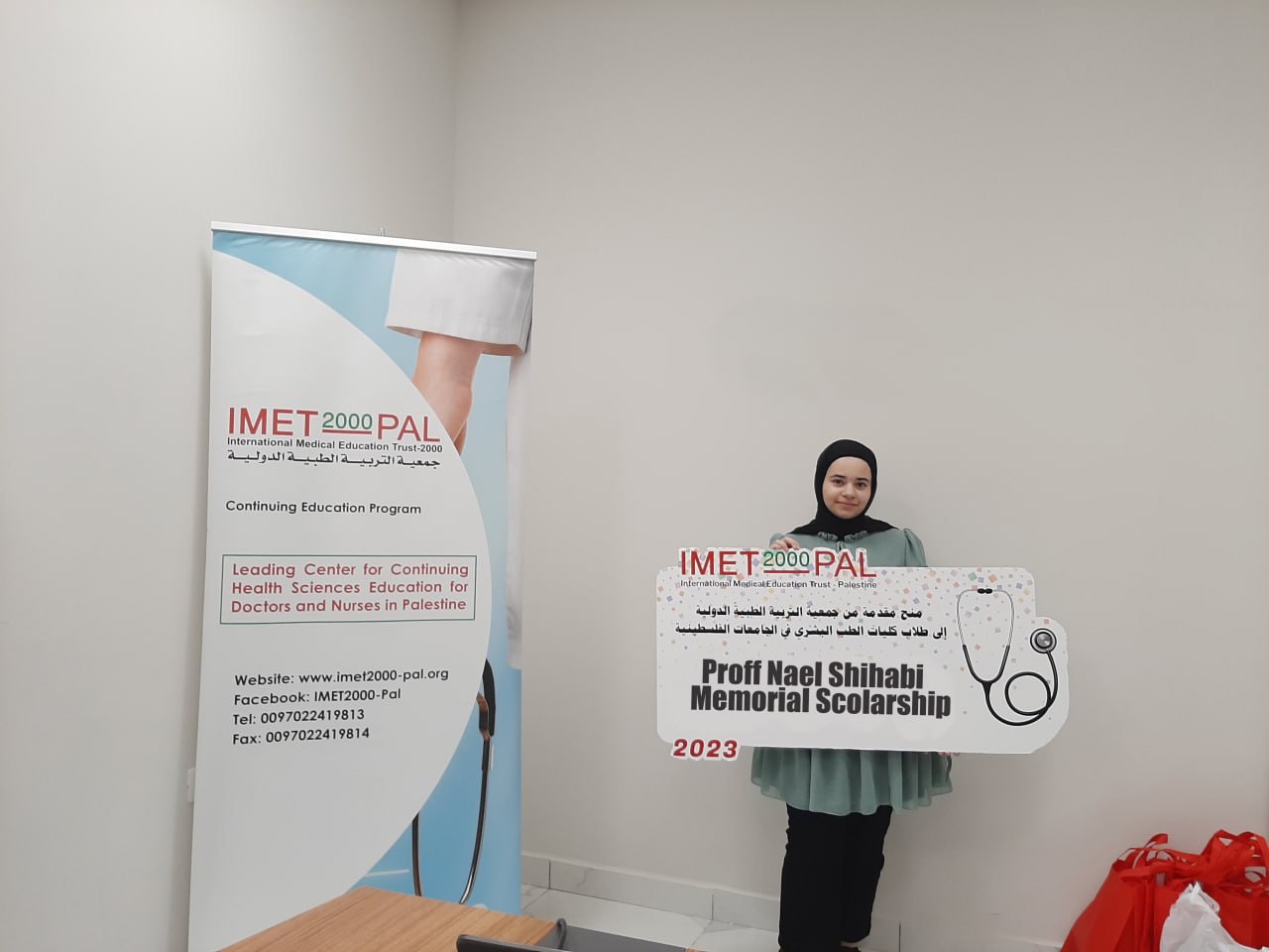 IMET2000-Pal; a Professor Nael Shihabi Memorial Scholarship to study human medicine at the Arab American University-Jenin (2023) for medical student Rania Saba’neh