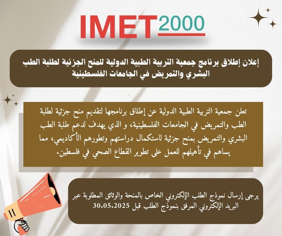 [محدث] إعلان إطلاق برنامج جمعية التربية الطبية الدولية للمنح الجزئية لطلبة الطب البشري والتمريض في الجامعات الفلسطينية