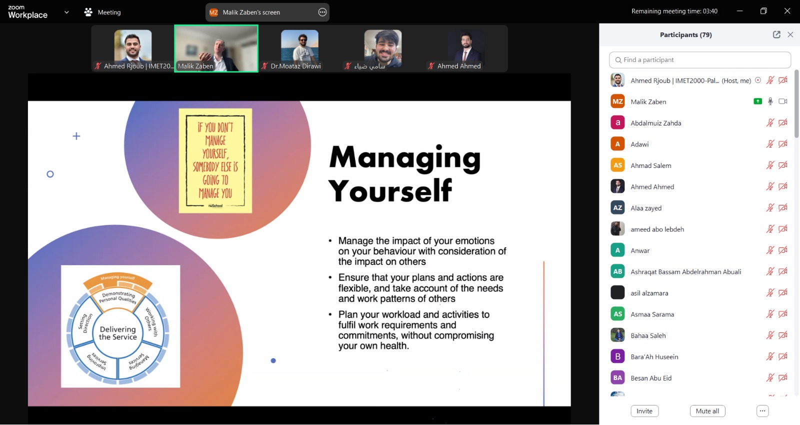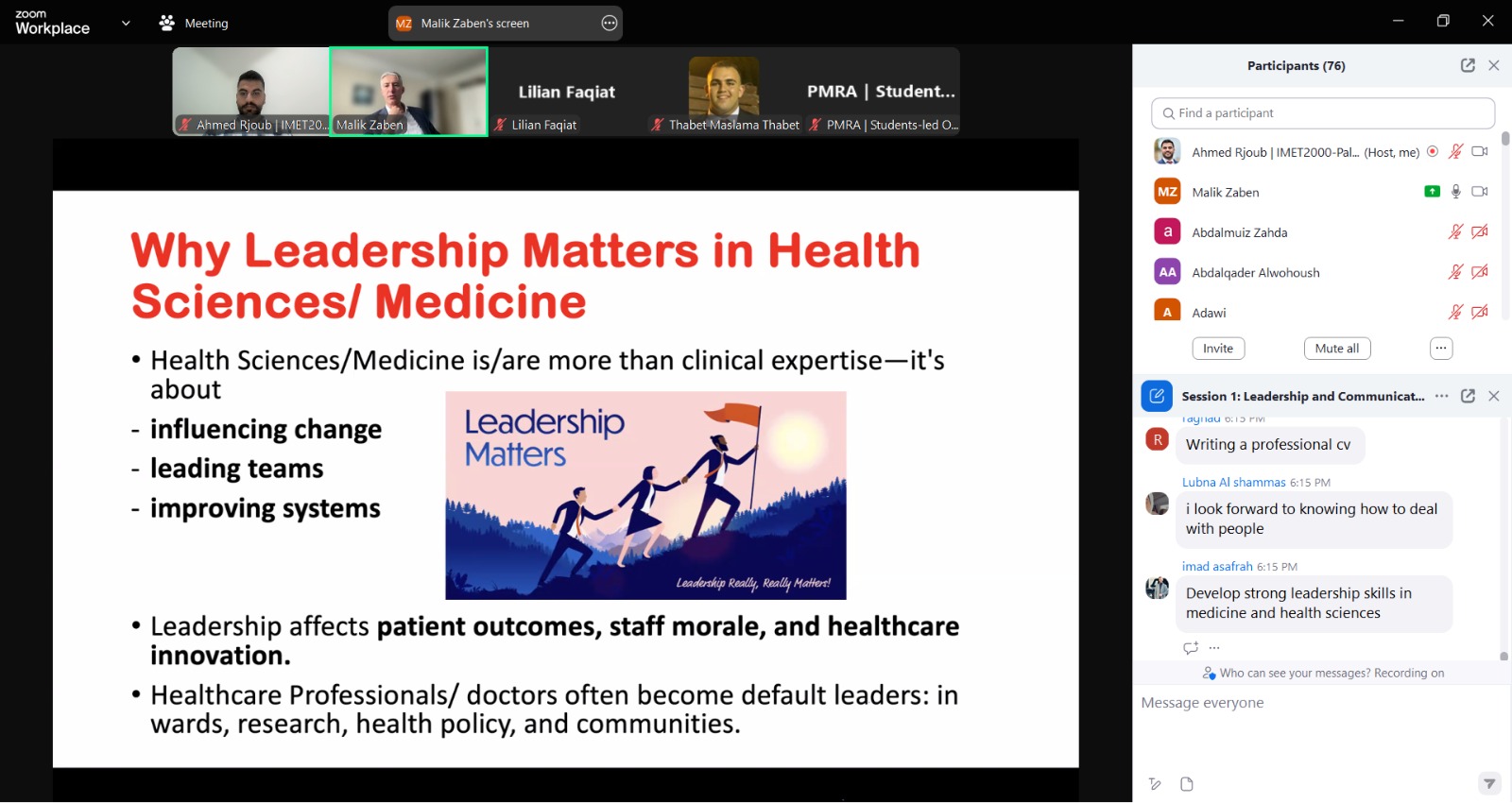 أدار فعاليات الورشة الأستاذ الدكتور مالك زبن، المدير التنفيذي لجمعية التربية الطبية الدولية وعميد كلية الطب في الجامعة العربية الأمريكية، حيث تمحورت الجلسة التدريبية حول تطوير المهارات القيادية الفردية وتعزيز أساليب التواصل الفعّال مع الزملاء في الفريق الصحي والمرضى، مع تسليط الضوء على أحدث تقنيات الاتصال، وأهمية مهارات الاستماع النشط، إضافة إلى استراتيجيات إدارة النزاعات في بيئة العمل الصحية.