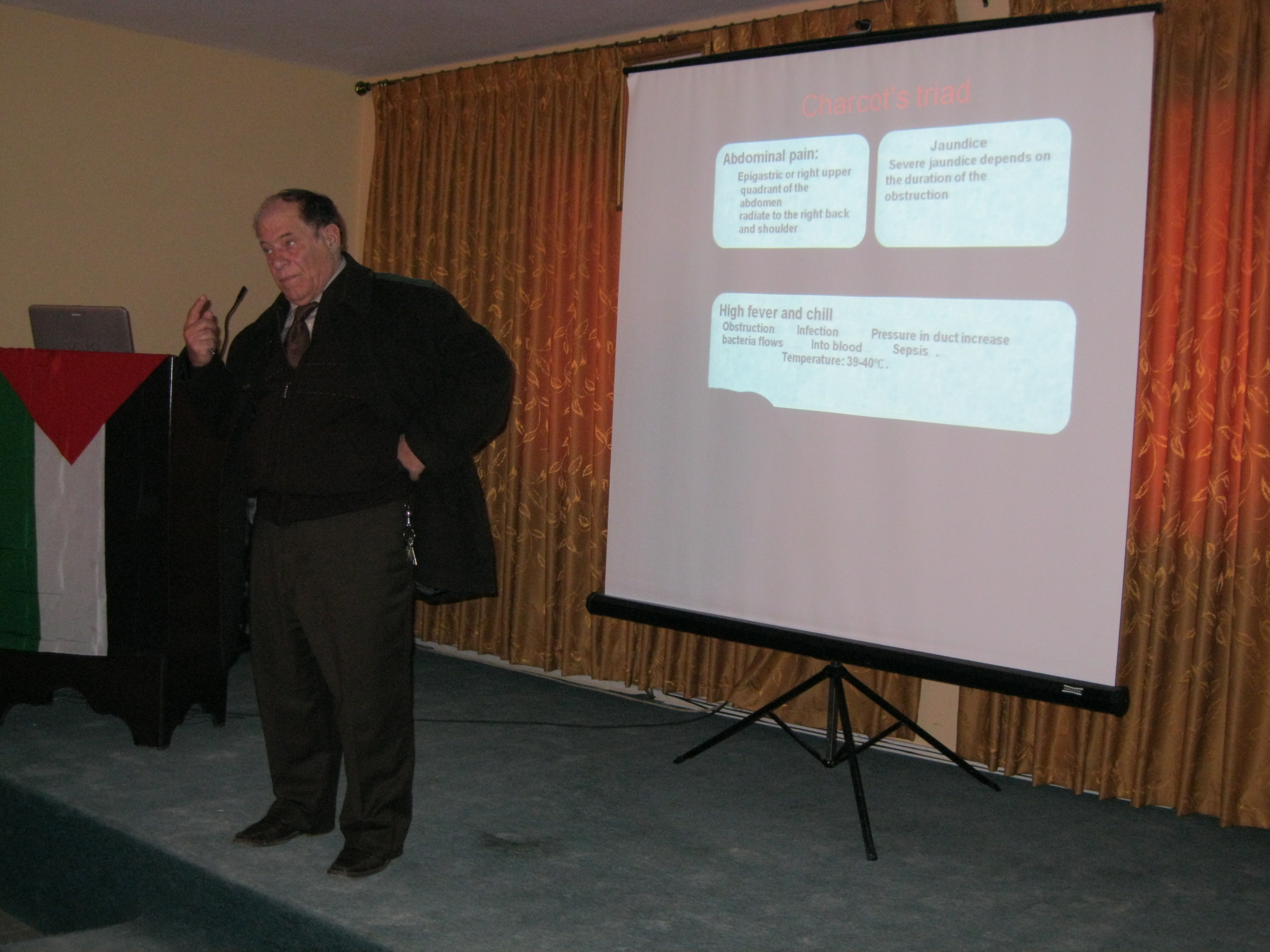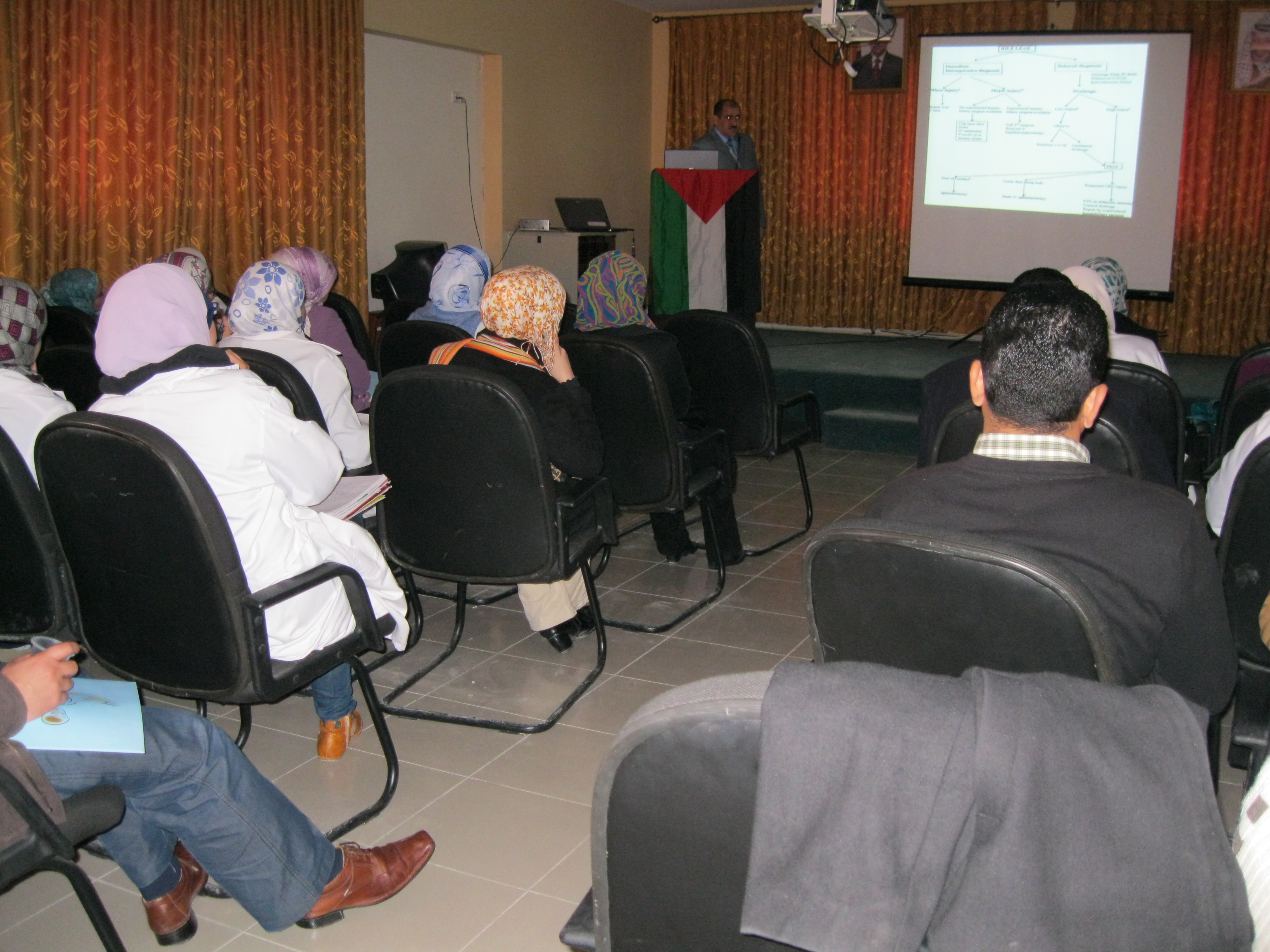بدأت الجلسة بكلمة للدكتور أحمد أبو تايه ، (دائرة التعليم الطبي في المؤسسة) ، شكر فيها كل من وزارة الصحة الفلسطينية ممثلة بالدكتور نعيم صبرة ، مدير عام المستشفيات ، و شركة دار الشفاء للأدوية على رعاية الدورة. كما حاضر في الجسلة كل من الدكتورعبد الله حواري( رئيس قسم الجراحة في المستشفى العربي) ، محاضر في كلية الطب - جامعة النجاح والدكتوراسامة البشتاوي الرئيس السابق لجمعية اطباء الجراحة.