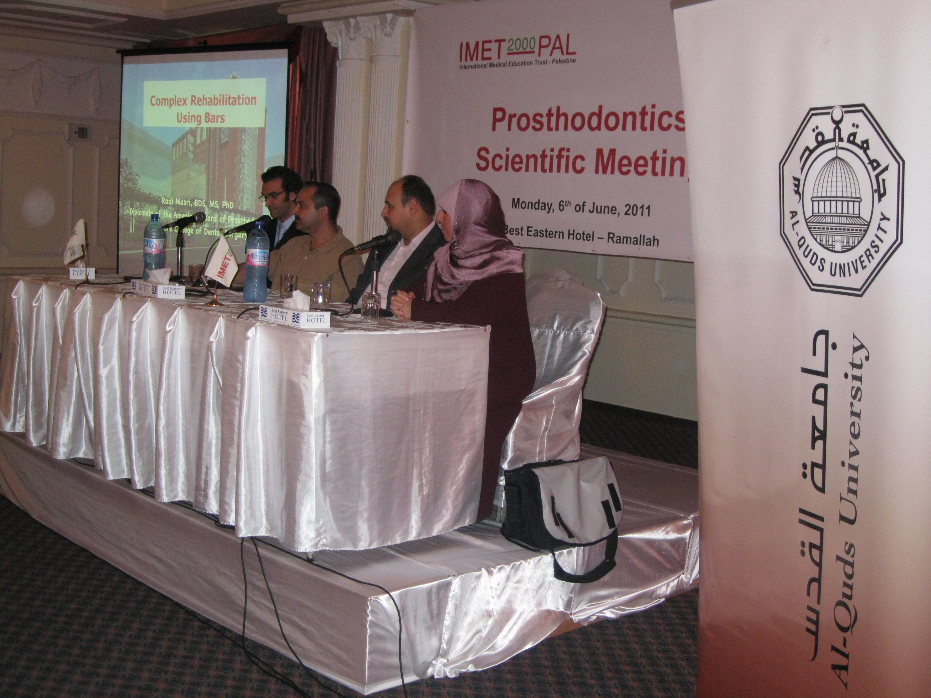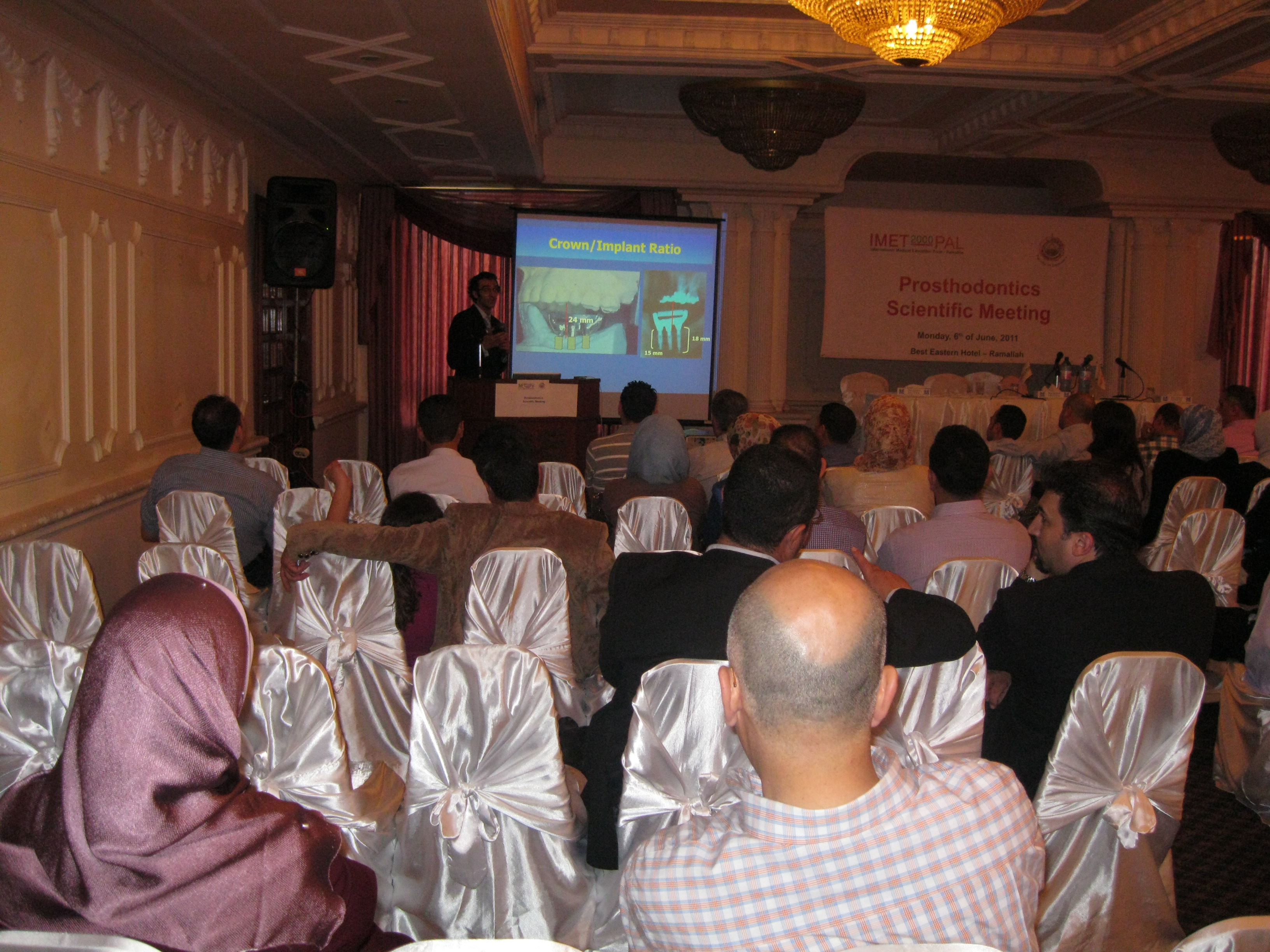 برعاية كل منالمؤسسة الدولية للتعليم الطبي- فلسطينIMET2000-Pal و كلية طب الأسنان – جامعة القدس وبالتنسيق مع نقابة أطباء الأسنان، أقيمت بالأمس أمسية علمية لأطباء الأسنان في فندق البست ايسترن / رام الله